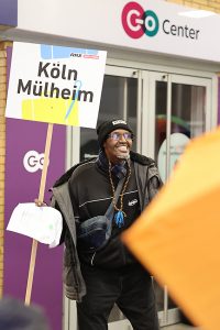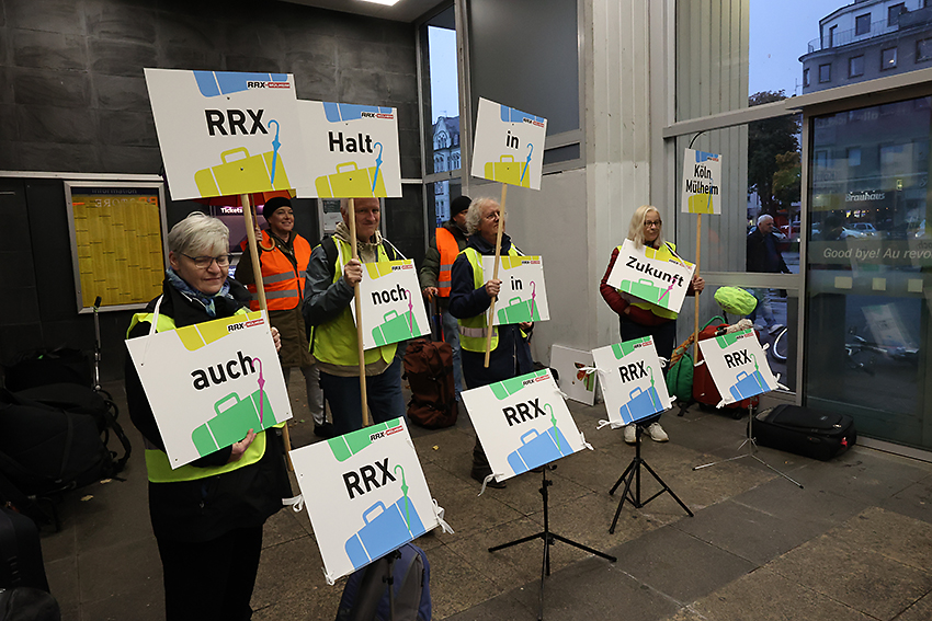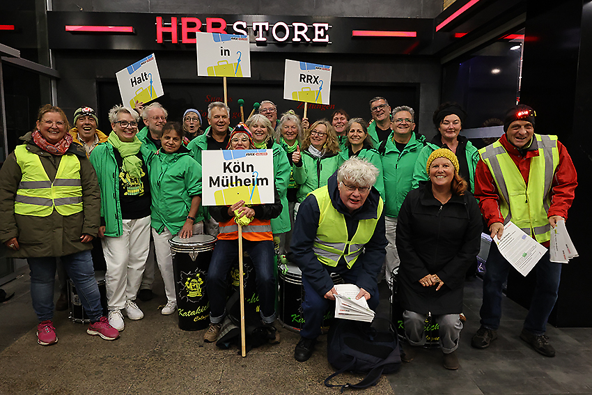 „RRX-Halt in Köln-Mülheim auch in Zukunft.“ Mit diesem Slogan hat unsere Bürgerinitiative am Freitag, 23. Oktober 2025“, für ein zusätzliches Gleis am Bahnhof demonstriert. Musikalische Unterstützung erhielten wir von der Samba-Gruppe  „Katakichi Cologne“, die in lautstarken Rhythmen für unsere Forderung trommelte.
