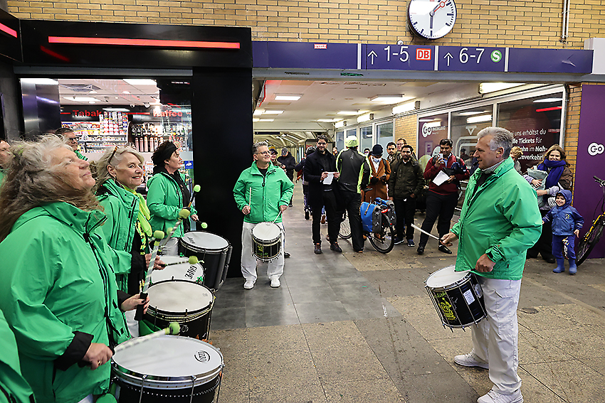 Trommeln für den RRX-Systemhalt. Unsere Bürgerinitiative demonstrierte im Oktober 2025 für den Infrastrukturausbau am Bahnhof Köln-Mülheim.