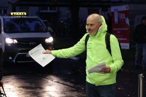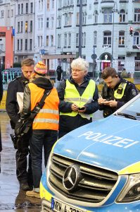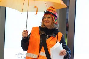 Die Aktion sollte ursprünglich auf dem Bahnhofsvorplatz stattfinden, musste aber wegen des stürmischen Regenwetters in die Bahnhofshalle verlegt werden. Die Polizei, bei der unsere Performance angemeldet war, zeigte großes Verständnis.